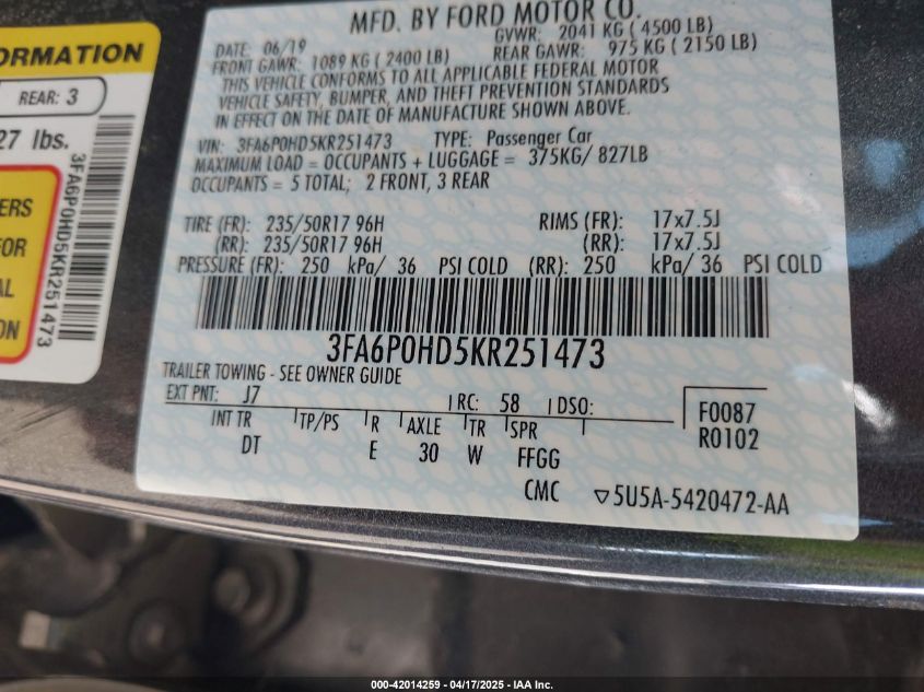 2019 FORD FUSION - 3FA6P0HD5KR251473, колір - Сірий, 1.5, Бензин, Передній привід із США