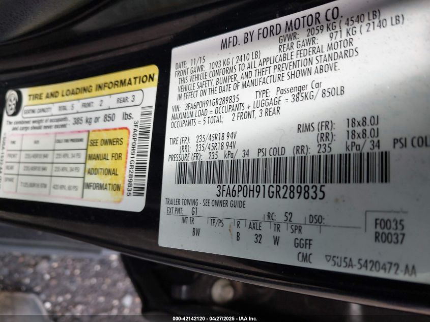 2016 FORD FUSION - 3FA6P0H91GR289835, колір - Чорний, 2.0, Бензин, Передній привід із США