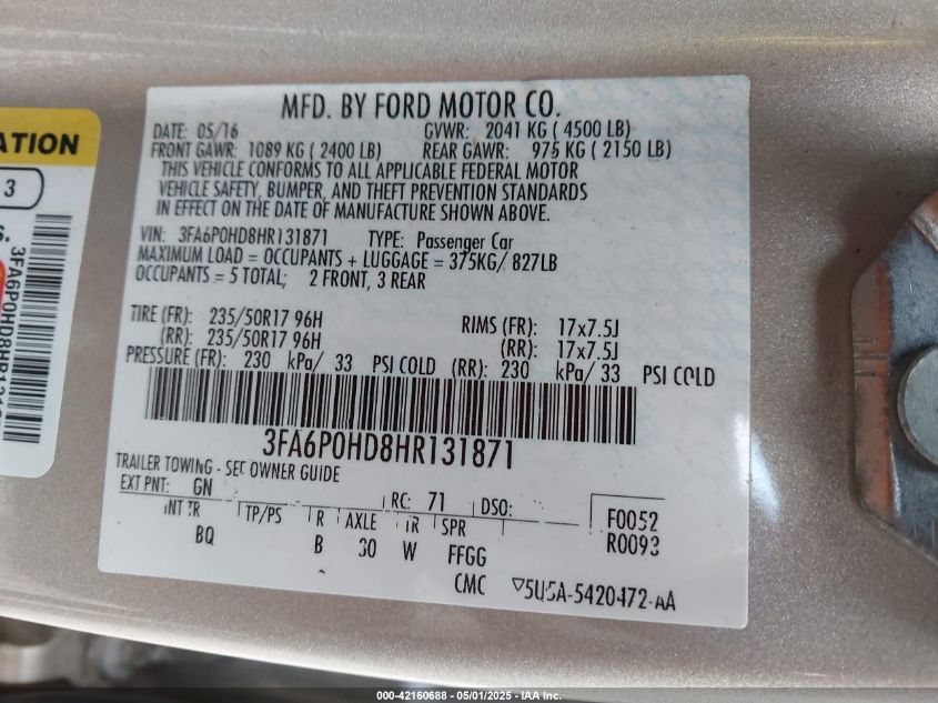 2017 FORD FUSION - 3FA6P0HD8HR131871, колір - Золотий, 1.5, Бензин, Передній привід із США