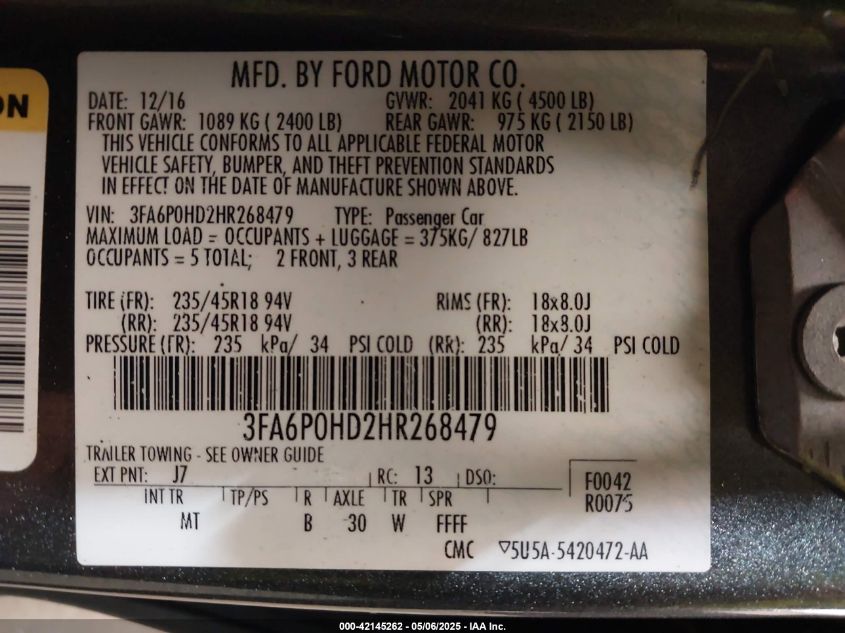 2017 FORD FUSION - 3FA6P0HD2HR268479, колір - Сірий, 1.5, Бензин, Передній привід із США