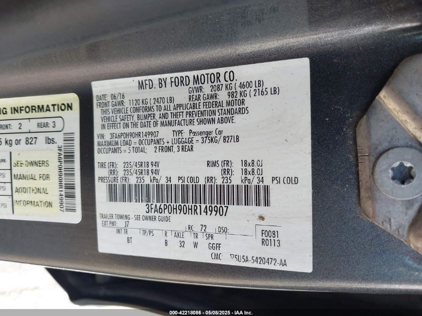 2017 FORD FUSION - 3FA6P0H90HR149907, колір - Сірий, 2.0, Бензин, Передній привід із США