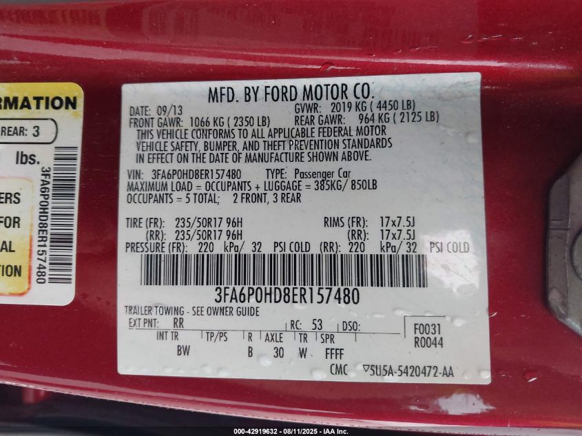 Колір ЧервонийЦиліндри 4Привід Передній привідVIN 3FA6P0HD8ER157480Стан СтаціонарноУшкодження Перекидання