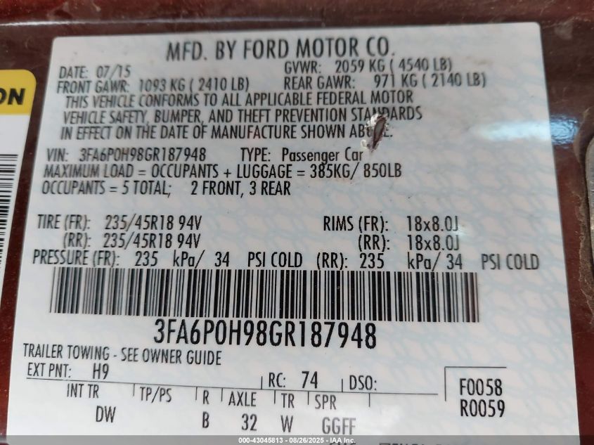 2016 FORD FUSION - 3FA6P0H98GR187948, колір - Апельсиновий, 2.0, Бензин, Передній привід із США