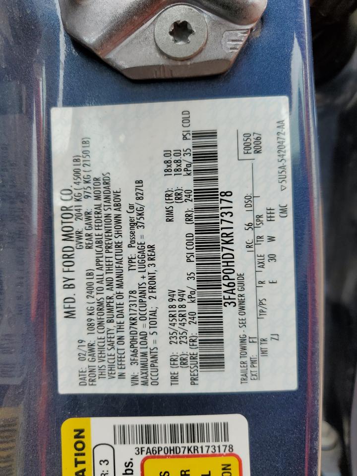 2019 FORD FUSION - 3FA6P0HD7KR173178, колір - Синій, 1.5, Бензин, із США