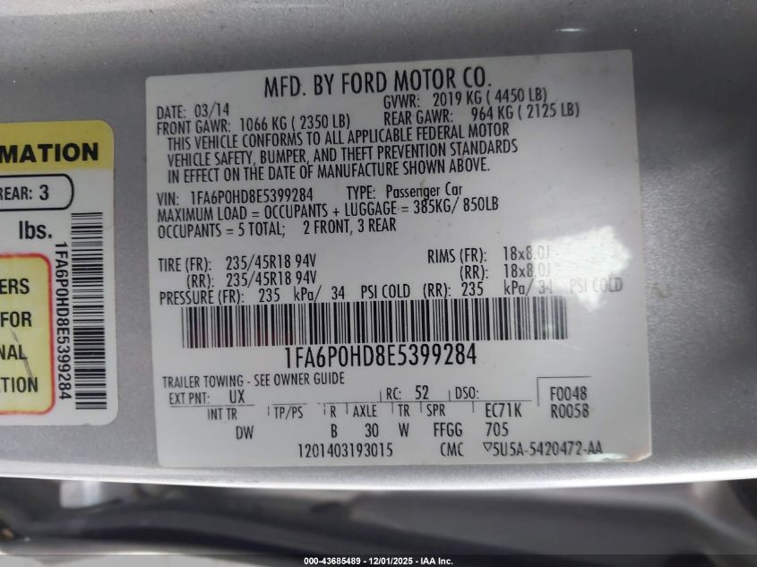Колір СрібнийЦиліндри 4Привід Передній привідVIN 1FA6P0HD8E5399284Стан Заводиться та їде (перевірено)Ушкодження Передня або задняДата аукціона 2025-12-22