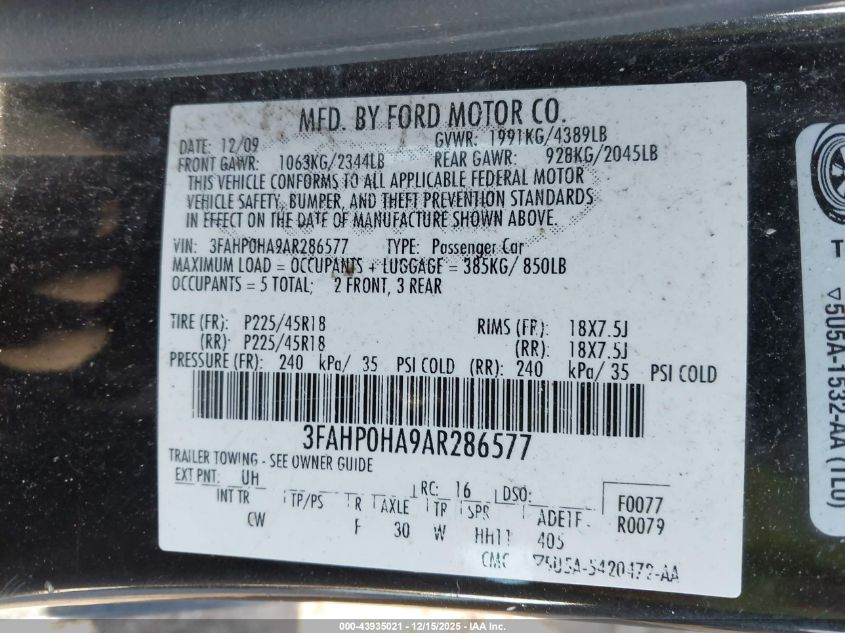 2010 FORD FUSION - 3FAHP0HA9AR286577, колір - , 2.5, Бензин, Передній привід із США