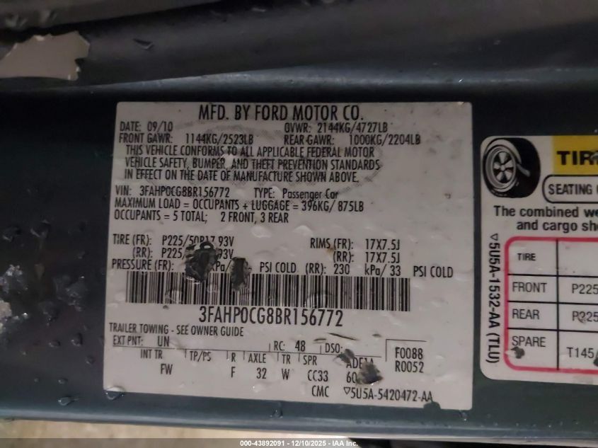 Колір СинійЦиліндри 6Привід Повний привідVIN 3FAHP0CG8BR156772Стан СтаціонарноУшкодження По всьому авто