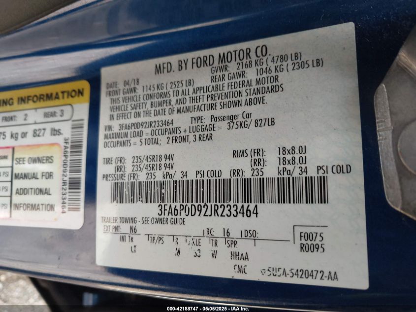 Колір СинійЦиліндри 4Привід Повний привідVIN 3FA6P0D92JR233464Стан Заводиться та їде (перевірено)Ушкодження Передня або задня