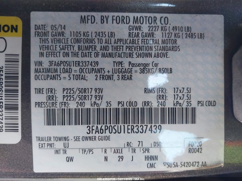 2014 FORD FUSION - 3FA6P0SU1ER337439, колір - Сірий, 2.0, Гібрид, Передній привід із США