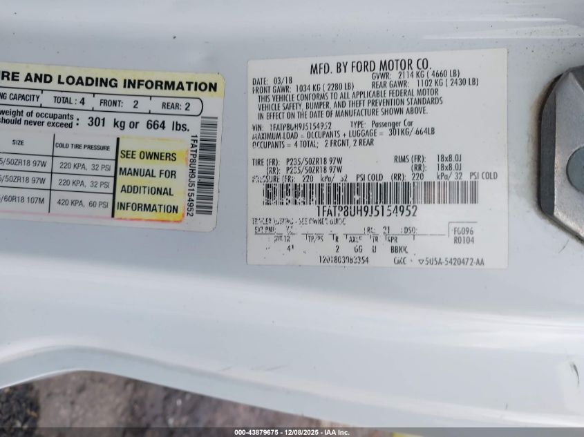 Колір БілийЦиліндри 4Привід Задній привідVIN 1FATP8UH9J5154952Стан Заводиться та їде (перевірено)Ушкодження Передня і задня