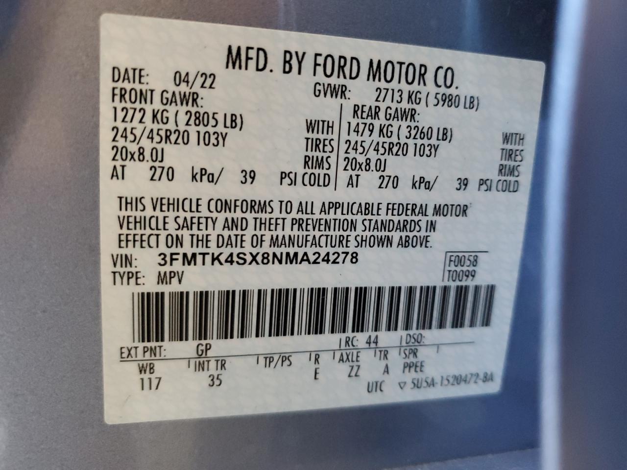 Колір СрібнийПривід Повний привідVIN 3FMTK4SX8NMA24278Стан Заводиться та їде (перевірено)Ушкодження Передня або задняДата аукціона 2025-10-08