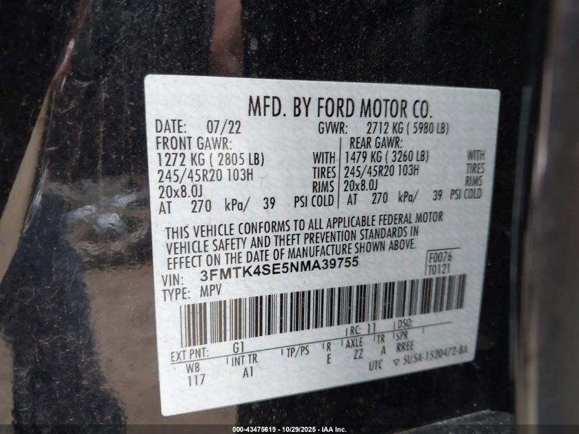 Колір ЧорнийПривід Повний привідVIN 3FMTK4SE5NMA39755Стан НевідомоУшкодження Передня або задняДата аукціона 2025-12-19