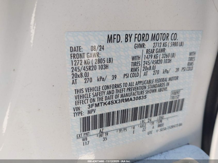 Колір БілийПривід Повний привідVIN 3FMTK4SX3RMA30835Стан НевідомоУшкодження Передня або задня