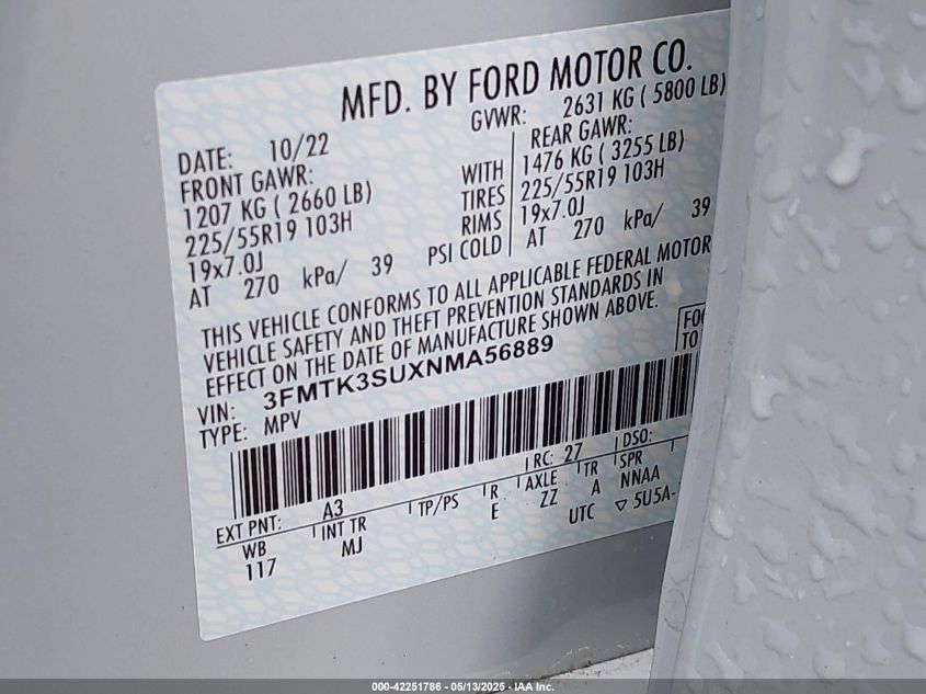2022 FORD MUSTANG MACH-E - 3FMTK3SUXNMA56889, колір - Білий, 0.0, Електричний, Повний привід із США