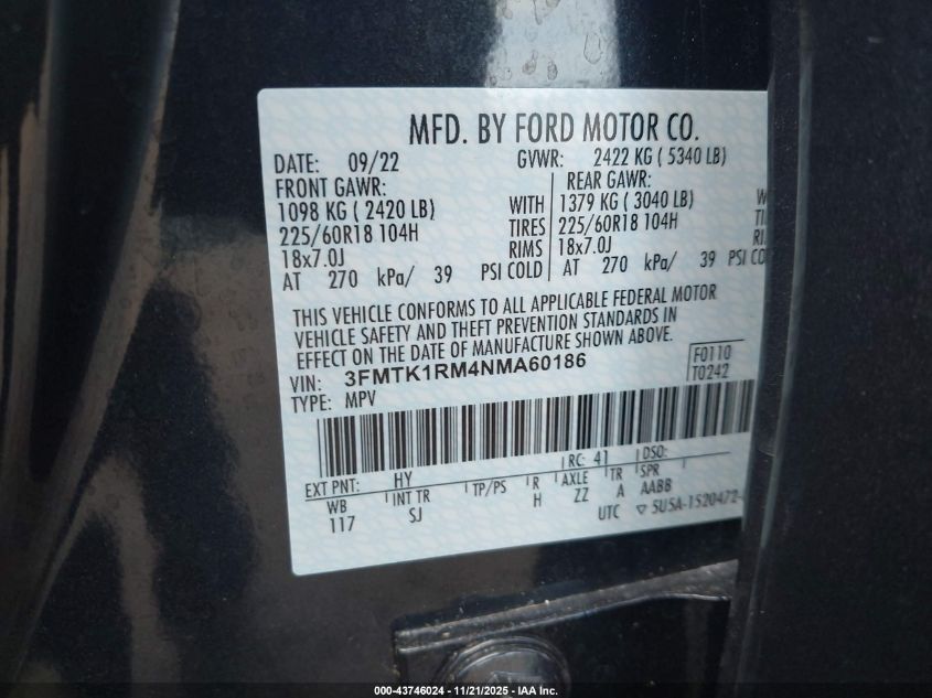 Колір ЧорнийVIN 3FMTK1RM4NMA60186Стан Заводиться та їде (перевірено)Ушкодження ЗадняДата аукціона 2025-12-18