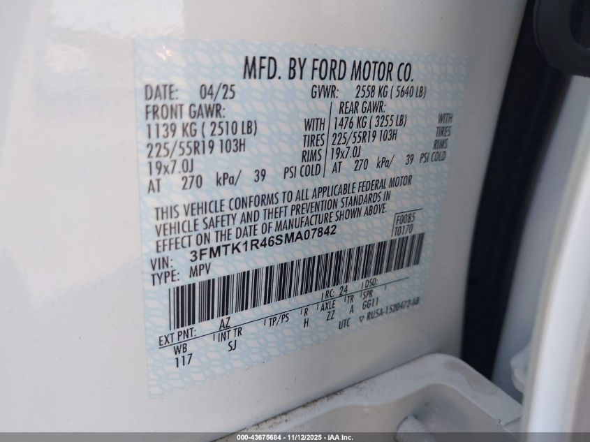 2025 FORD MUSTANG MACH-E - 3FMTK1R46SMA07842, колір - Білий, 0.0, Електричний, із США