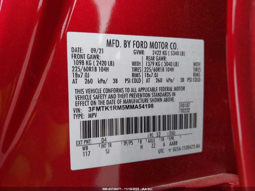 Колір ЧервонийVIN 3FMTK1RM5MMA54198Стан НевідомоУшкодження Права сторона