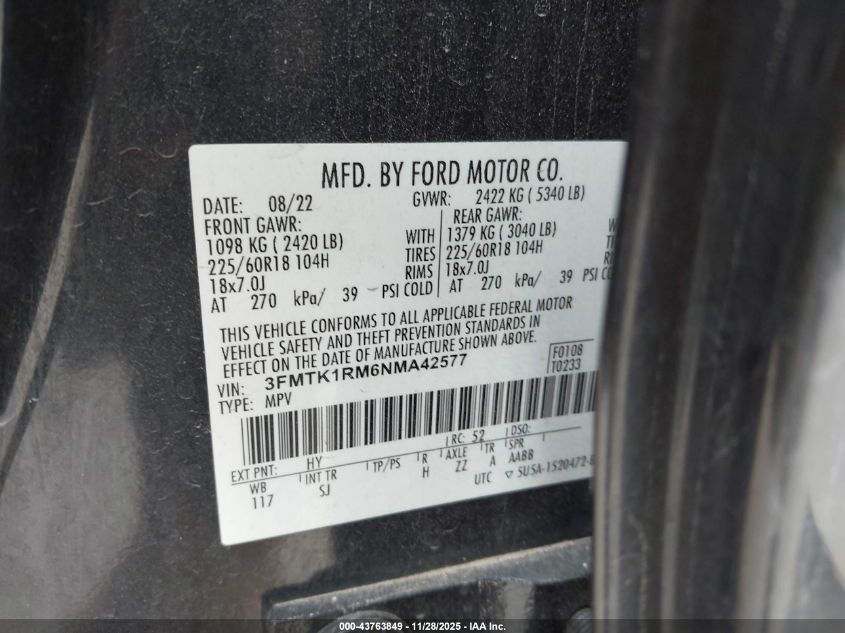 2022 FORD MUSTANG MACH-E - 3FMTK1RM6NMA42577, колір - Сірий, 0.0, Електричний, із США