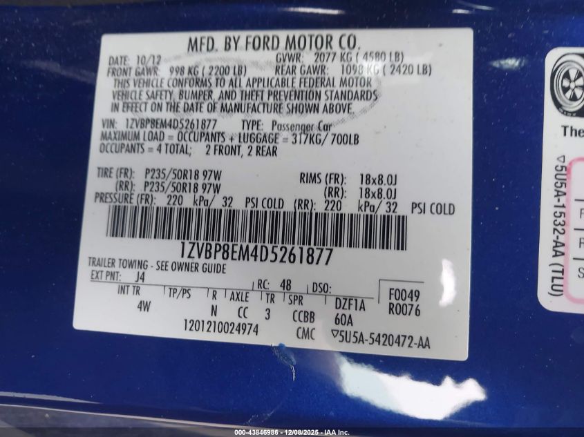Колір СинійЦиліндри 6Привід Задній привідVIN 1ZVBP8EM4D5261877Стан Заводиться та їде (перевірено)Ушкодження Передня або задня