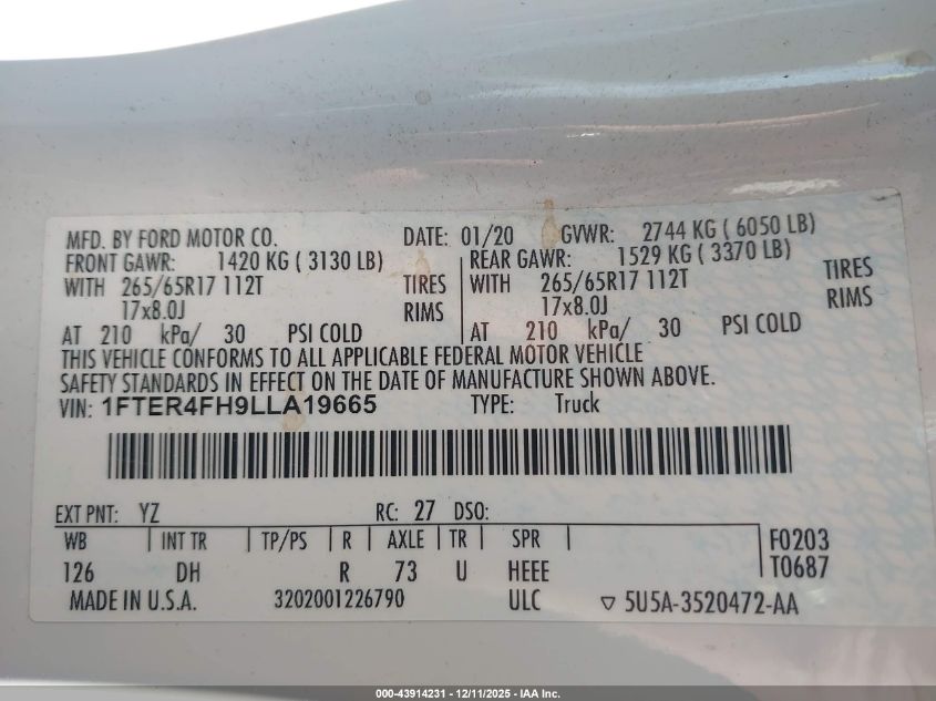 2020 FORD RANGER - 1FTER4FH9LLA19665, колір - Білий, 2.3, Бензин, Повний привід із США