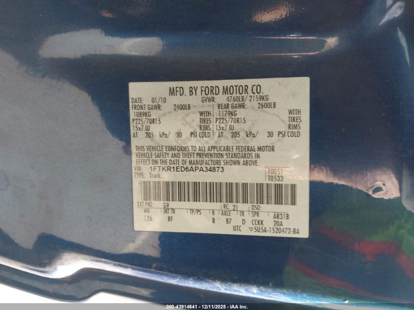 2010 FORD RANGER - 1FTKR1ED6APA34873, колір - Синій, 2.3, Бензин, із США