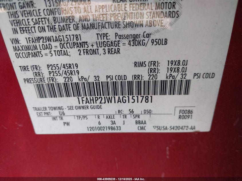 Колір ЧервонийЦиліндри 6Привід Повний привідVIN 1FAHP2JW1AG151781Стан Заводиться та їде (перевірено)Ушкодження ЗадняДата аукціона 2025-12-22