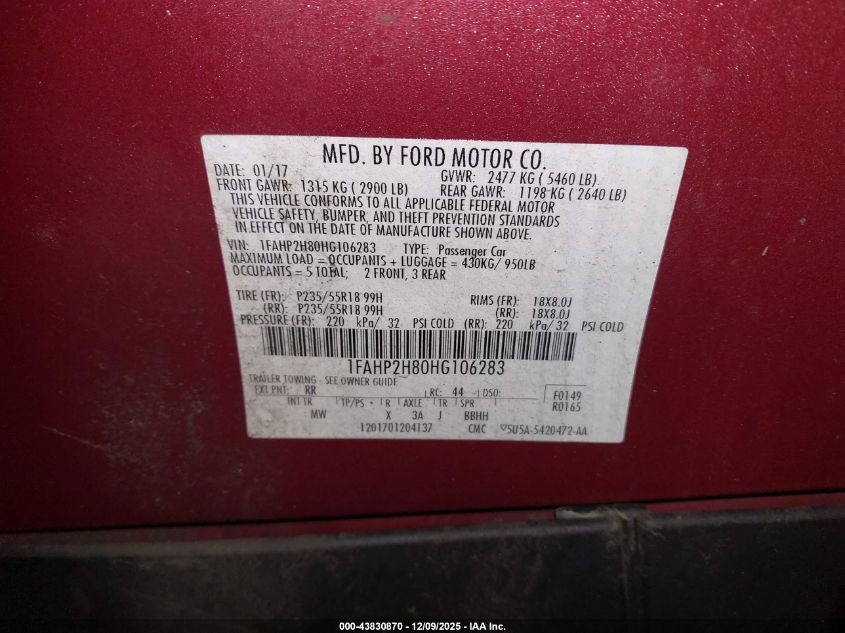 Колір ЧервонийЦиліндри 6Привід Повний привідVIN 1FAHP2H80HG106283Стан Заводиться та їде (перевірено)Ушкодження Передня або задняДата аукціона 2025-12-17