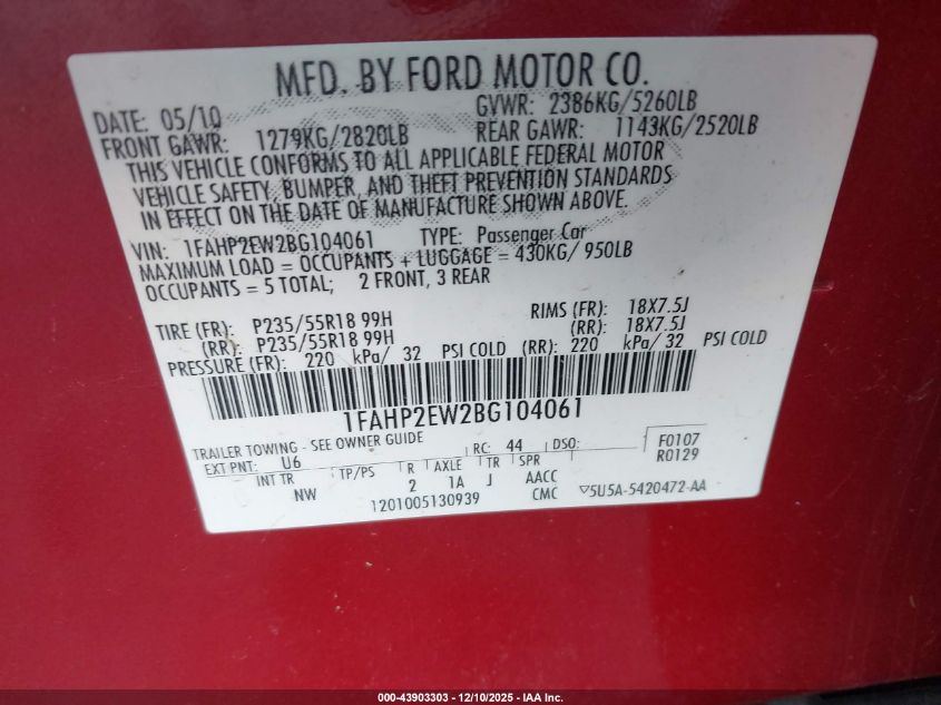2011 FORD TAURUS - 1FAHP2EW2BG104061, колір - Червоний, 3.5, Бензин, Передній привід із США