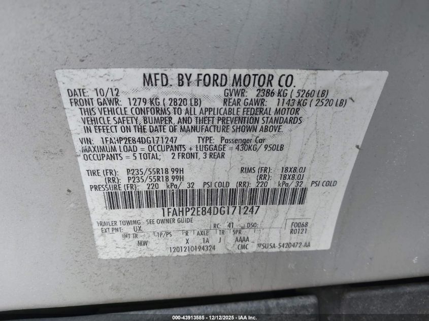 Колір СрібнийЦиліндри 6Привід Передній привідVIN 1FAHP2E84DG171247Стан СтаціонарноУшкодження Передня або задня