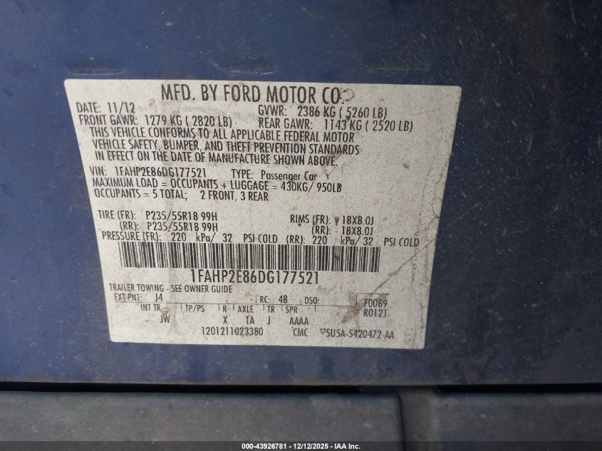 2013 FORD TAURUS - 1FAHP2E86DG177521, колір - Синій, 3.5, Бензин, Передній привід із США
