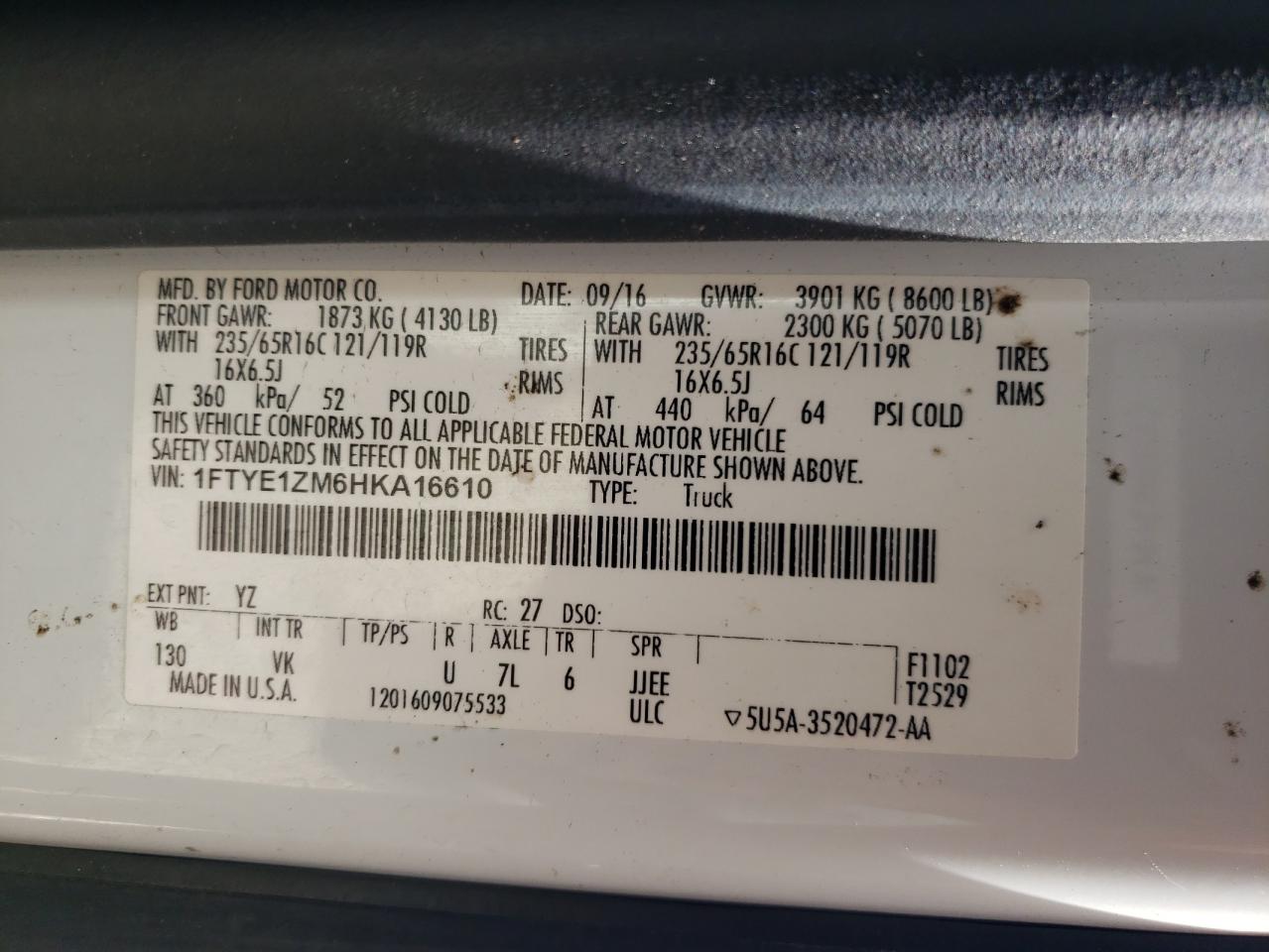 2017 FORD TRANSIT - 1FTYE1ZM6HKA16610, колір - Білий, 3.7, Бензин, Задній привід із США