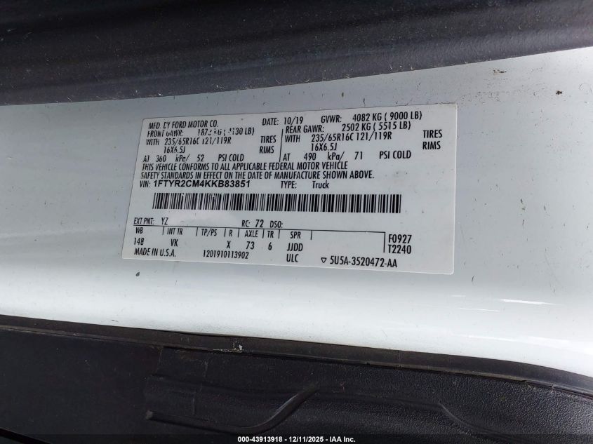 2019 FORD TRANSIT - 1FTYR2CM4KKB83851, колір - Білий, 3.7, Бензин, Задній привід із США