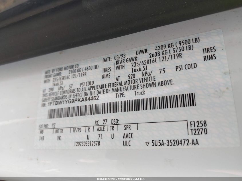 2023 FORD TRANSIT - 1FTBW1YG9PKA84462, колір - Білий, 3.5, Бензин, Задній привід із США