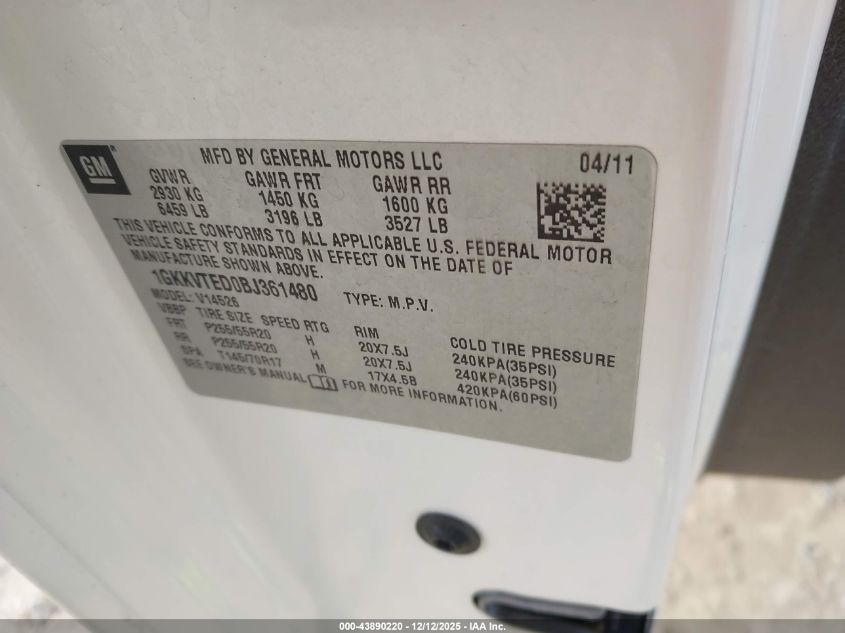 Колір БілийЦиліндри 6Привід Повний привідVIN 1GKKVTED0BJ361480Стан Заводиться та їде (перевірено)Ушкодження Передня або задня
