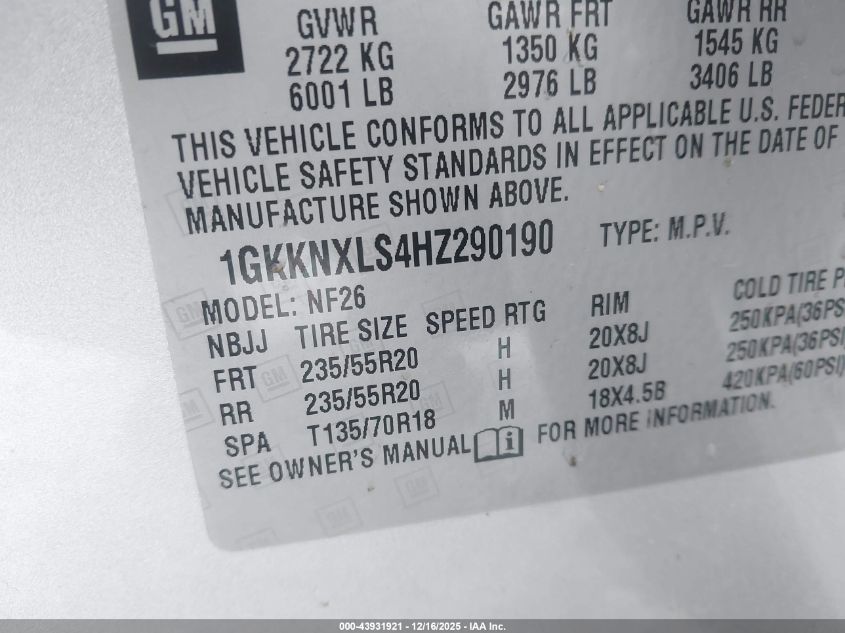Колір СрібнийЦиліндри 6Привід Повний привідVIN 1GKKNXLS4HZ290190Стан НевідомоУшкодження Звичайний знос