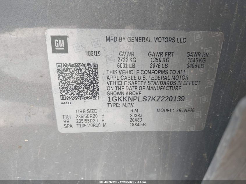Колір СірийЦиліндри 6Привід Передній привідVIN 1GKKNPLS7KZ220139Стан НевідомоУшкодження Передня або задня