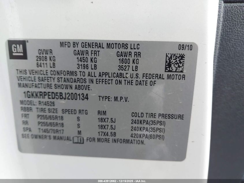 Колір БілийЦиліндри 6Привід Передній привідVIN 1GKKRPED5BJ200134Стан СтаціонарноУшкодження Права сторона