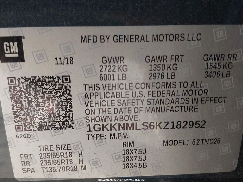 Колір Циліндри 6Привід Передній привідVIN 1GKKNMLS6KZ182952Стан НевідомоУшкодження Невідомо