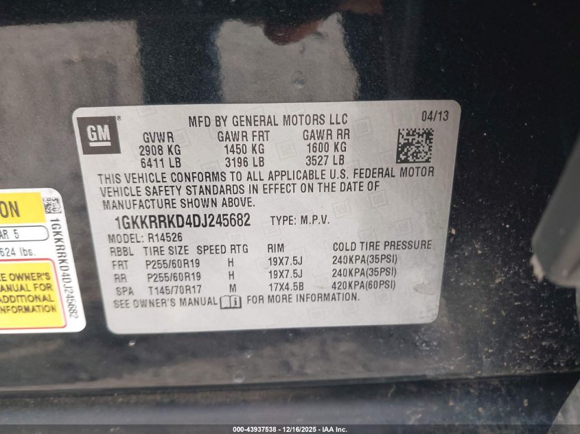 Колір ЧорнийЦиліндри 6Привід Передній привідVIN 1GKKRRKD4DJ245682Стан НевідомоУшкодження Невідомо