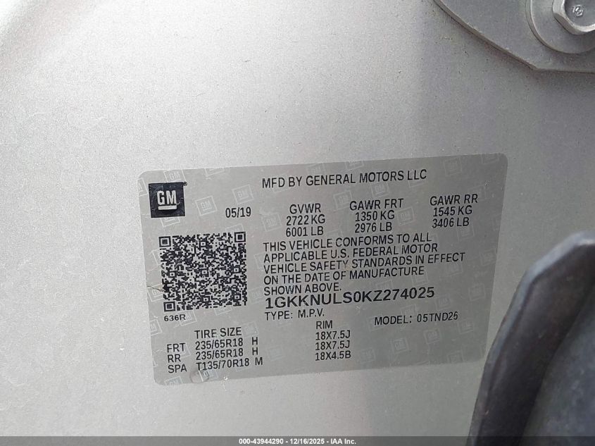 Колір СрібнийЦиліндри 6Привід Повний привідVIN 1GKKNULS0KZ274025Стан НевідомоУшкодження Невідомо