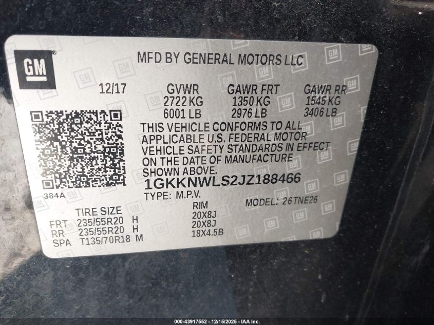 Колір ЧорнийЦиліндри 6Привід Повний привідVIN 1GKKNWLS2JZ188466Стан СтаціонарноУшкодження Передня або задня