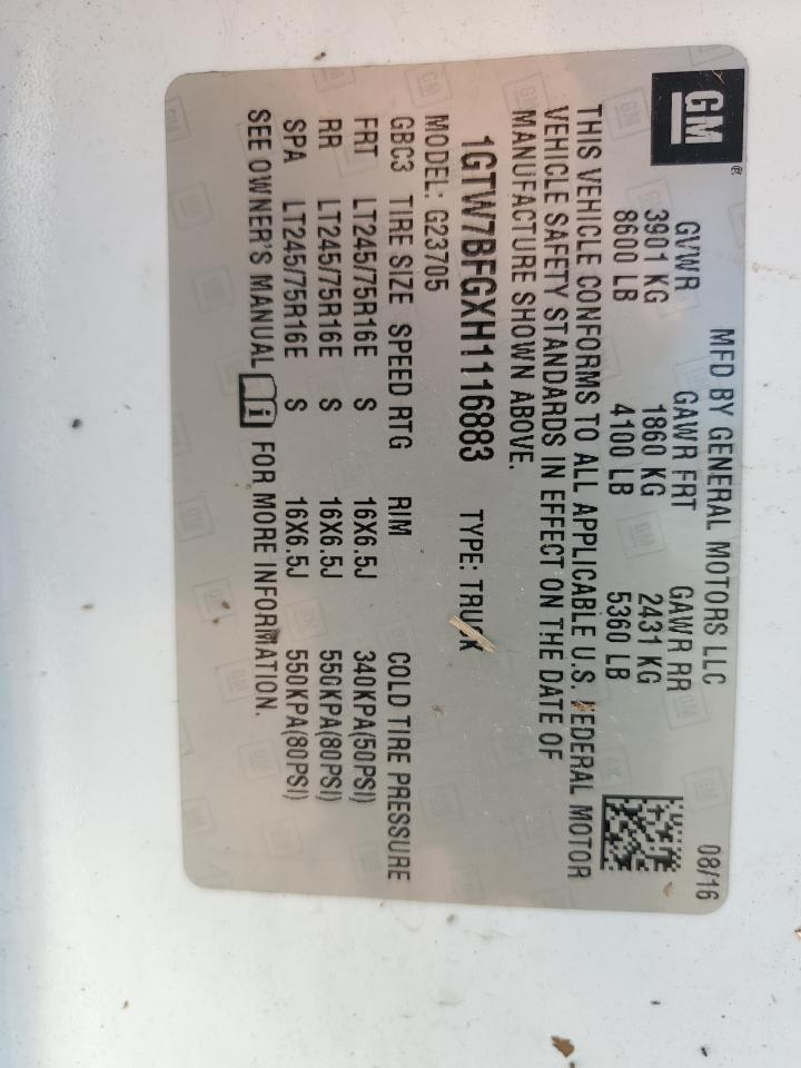 Колір БілийЦиліндри 8Привід Задній привідVIN 1GTW7BFGXH1116883Стан НевідомоУшкодження ВодаДата аукціона 2025-10-15