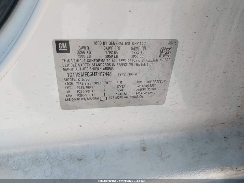 2017 GMC SIERRA 1500 - 1GTV2MEC5HZ107448, колір - Білий, 5.3, Бензин, Повний привід із США