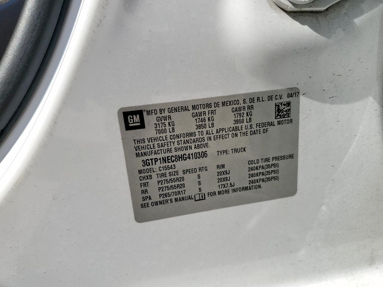 Колір БілийЦиліндри 8Привід Задній привідVIN 3GTP1NEC8HG410306Стан Заводиться та їде (перевірено)Ушкодження НезначніДата аукціона 2025-10-09