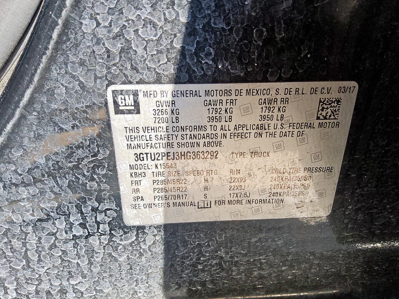 Колір ЧорнийЦиліндри 8Привід 4x4 з заднім приводомVIN 3GTU2PEJ3HG363292Стан Заводиться та їде (перевірено)Ушкодження НезначніДата аукціона 2025-10-09