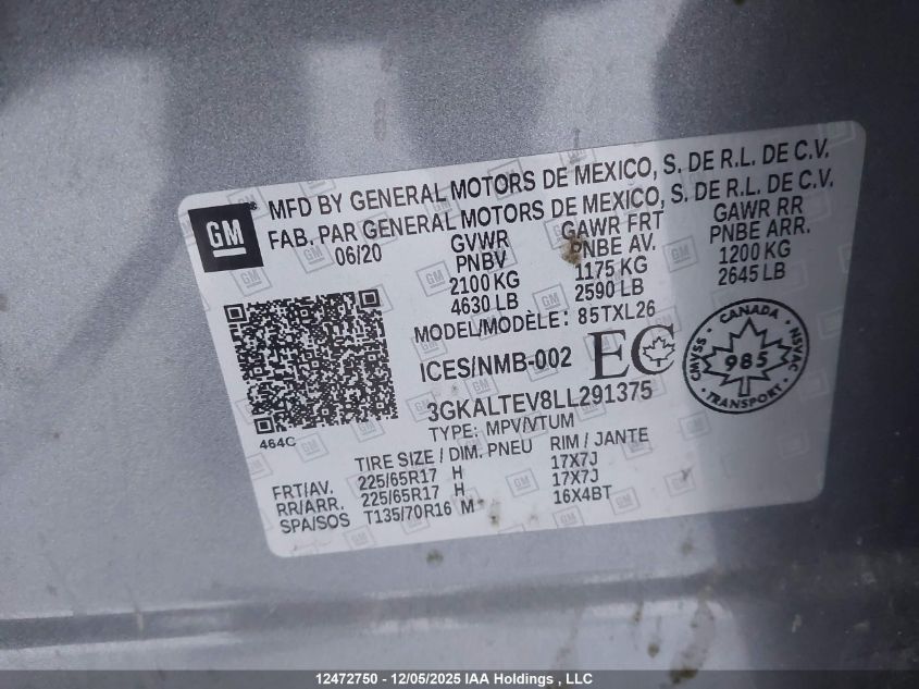 2020 GMC TERRAIN - 3GKALTEV8LL291375, колір - Сірий, , Бензин, Повний привід із США