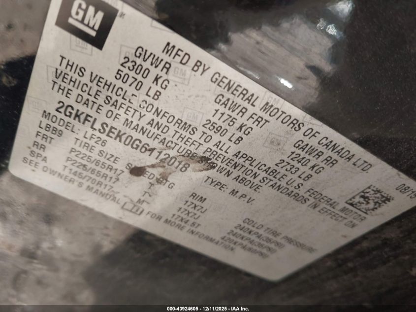Колір ЧорнийЦиліндри 4Привід Повний привідVIN 2GKFLSEK0G6112018Стан Заводиться та їде (перевірено)Ушкодження Звичайний зносДата аукціона 2025-12-23