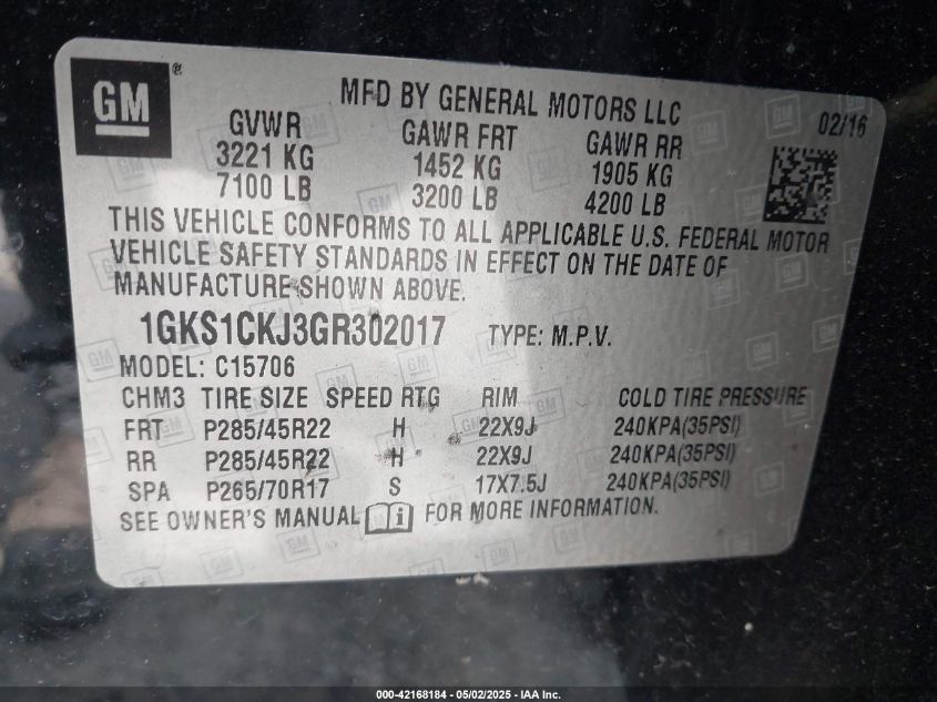 2016 GMC YUKON - 1GKS1CKJ3GR******, колір - Чорний, 6.2, Бензин, із США