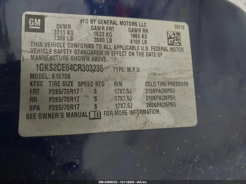 Колір СинійЦиліндри 8Привід Повний привідVIN 1GKS2CE04CR303235Стан Заводиться та їде (перевірено)Ушкодження Передня або задня
