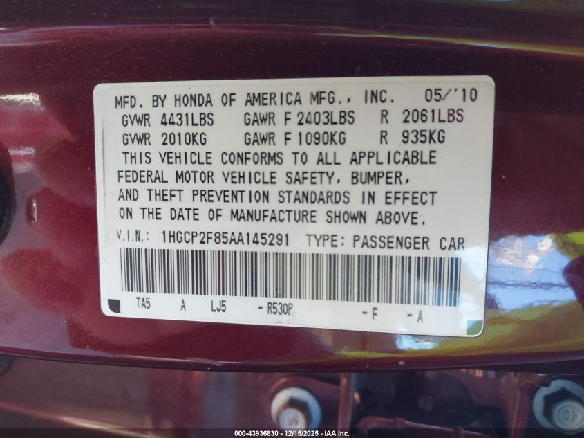 2010 HONDA ACCORD - 1HGCP2F85AA145291, колір - Бургундія, 2.4, Бензин, Передній привід із США